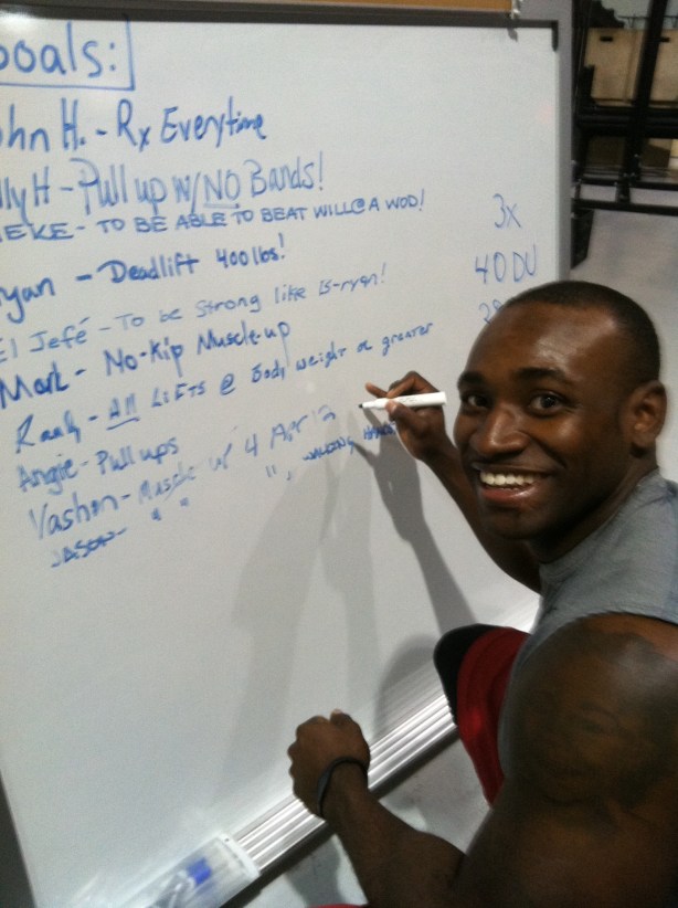 Congrats to Vashon Bynum on his first muscle up Wednesday. This is a pic of him crossing it off the Goal whiteboard. See that ear-to-ear smile? I promise each and every one of you, you will have the same look when you get your first!