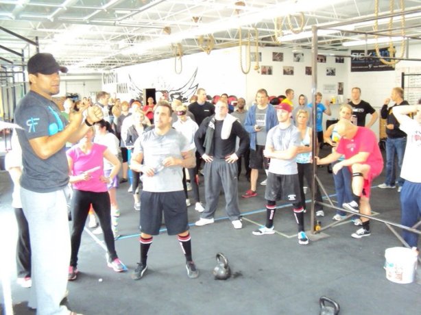 Picture courtesy of CrossFit Omaha. Now, normally, I don’t like putting pics of me up on the website (yes, that’s me in Buckeye red). the site is about you guys, not me, but just wanted to show you a glimpse of the fun craziness from last year’s throwdown. This was before workout 2 I believe as Ricky was giving us all a quick rundown of what we were to do. As you can see, it was a full house. What’s say we make it overrun with TOTF athletes?!!! CAN!